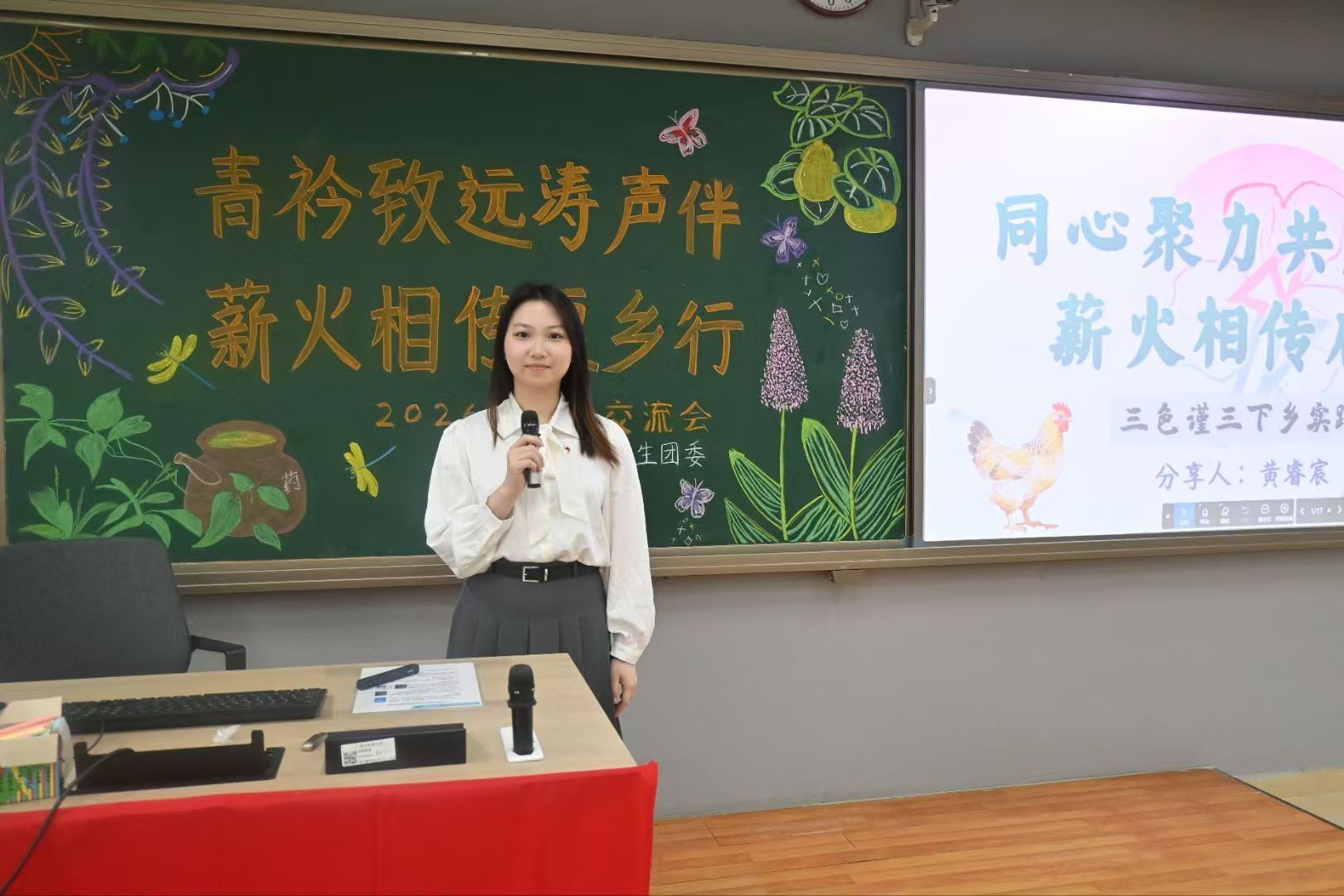 随后三色谨三下乡实践队队长黄睿宸介绍了“三下乡”活动的基本流程,并分享了下乡前中后期各个阶段的工作经验。她强调,下乡活动的设计需做到因地制宜,避免“形式化”,确保能为下乡地带来实质性的帮助。黄睿宸同学的分享逻辑清晰,内容务实,为将在今年暑期启程的下乡队伍提供了可借鉴推广的宝贵经验。