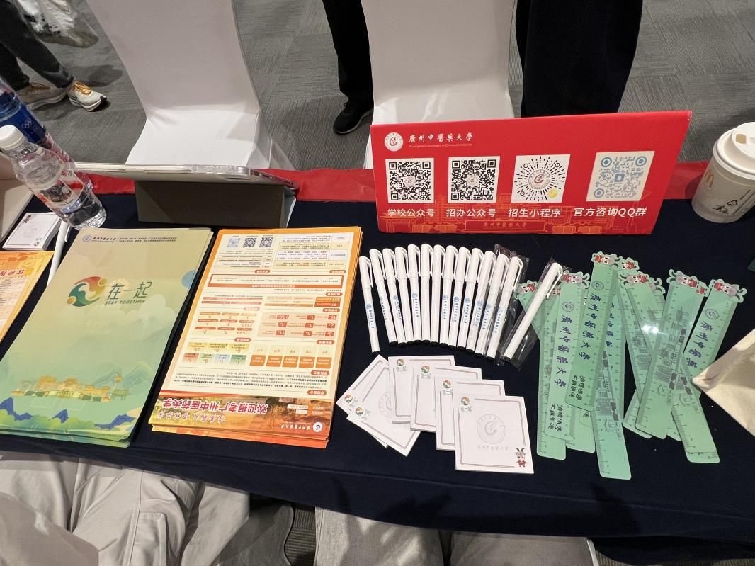本次活动由第一临床医学院师延泽老师带队,中西医临床医学专业2024级学生林涵、牛文龙共同参与。上午八时,团队准时抵达现场,迅速投入到前期准备工作中:立牌整齐排开,宣传资料有序摆放,文创产品点缀其间,横幅徐徐展开,一方小小展位逐渐呈现出广州中医药大学的独特气质与底蕴。