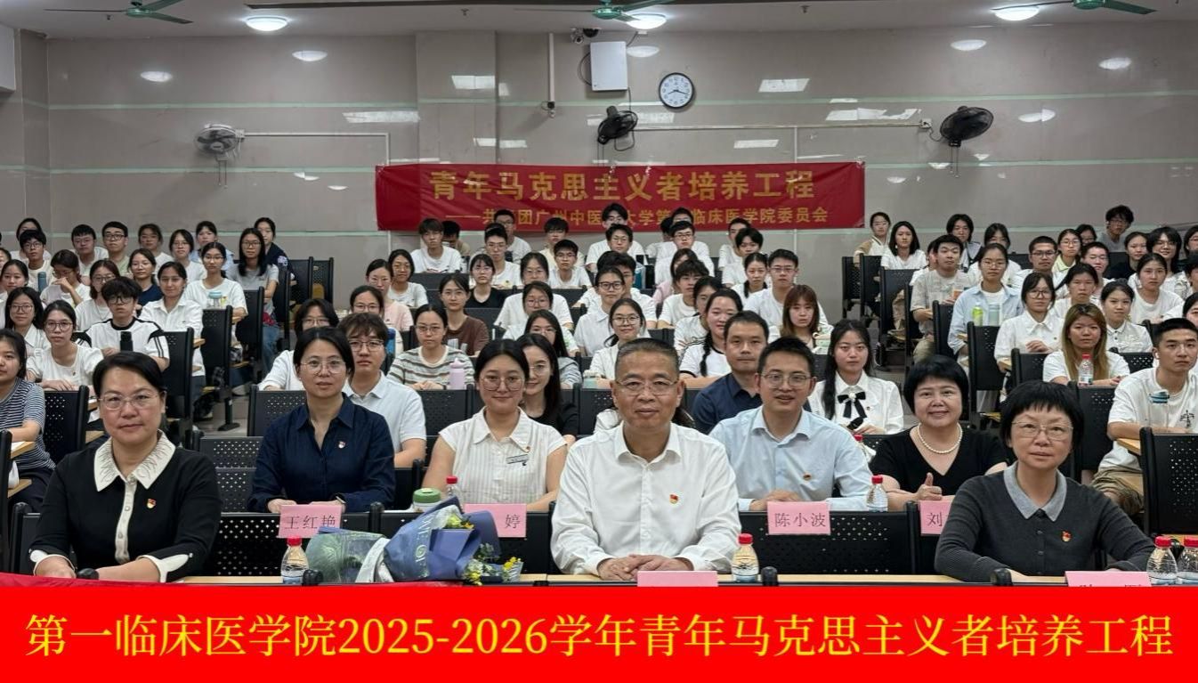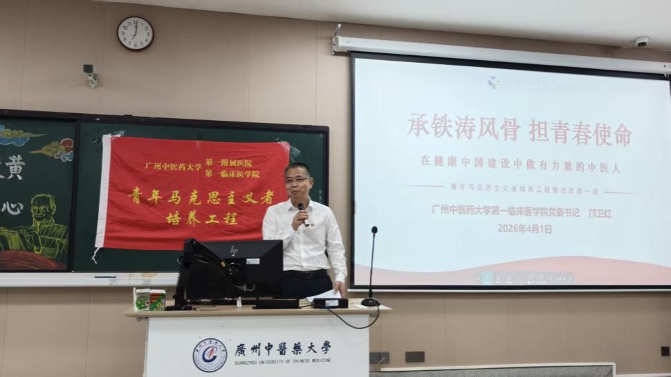 2026年4月1日,广州中医药大学第一临床医学院学生团委在综合楼104举办了2025-2026学年青马工程暨思政第一课。本次活动以“青衿致远承岐黄,铸魂育人润初心”为主题,聚焦“铁涛精神”的时代价值,通过理论阐释与互动实践相结合的形式,引导青马学员深刻把握“爱国与爱中医”的辩证关系,深入理解“个人发展与民族复兴”的实践逻辑。本次活动特邀学院党委书记邝卫红老师主讲,学院教学党总支书记陈雁,医院纪检室主任王红艳,教育教学部部长龙泳伶及学院学工办辅导员等领导老师参与,现场共有62名青马学员以及59名24级中医学八年制的同学参加。