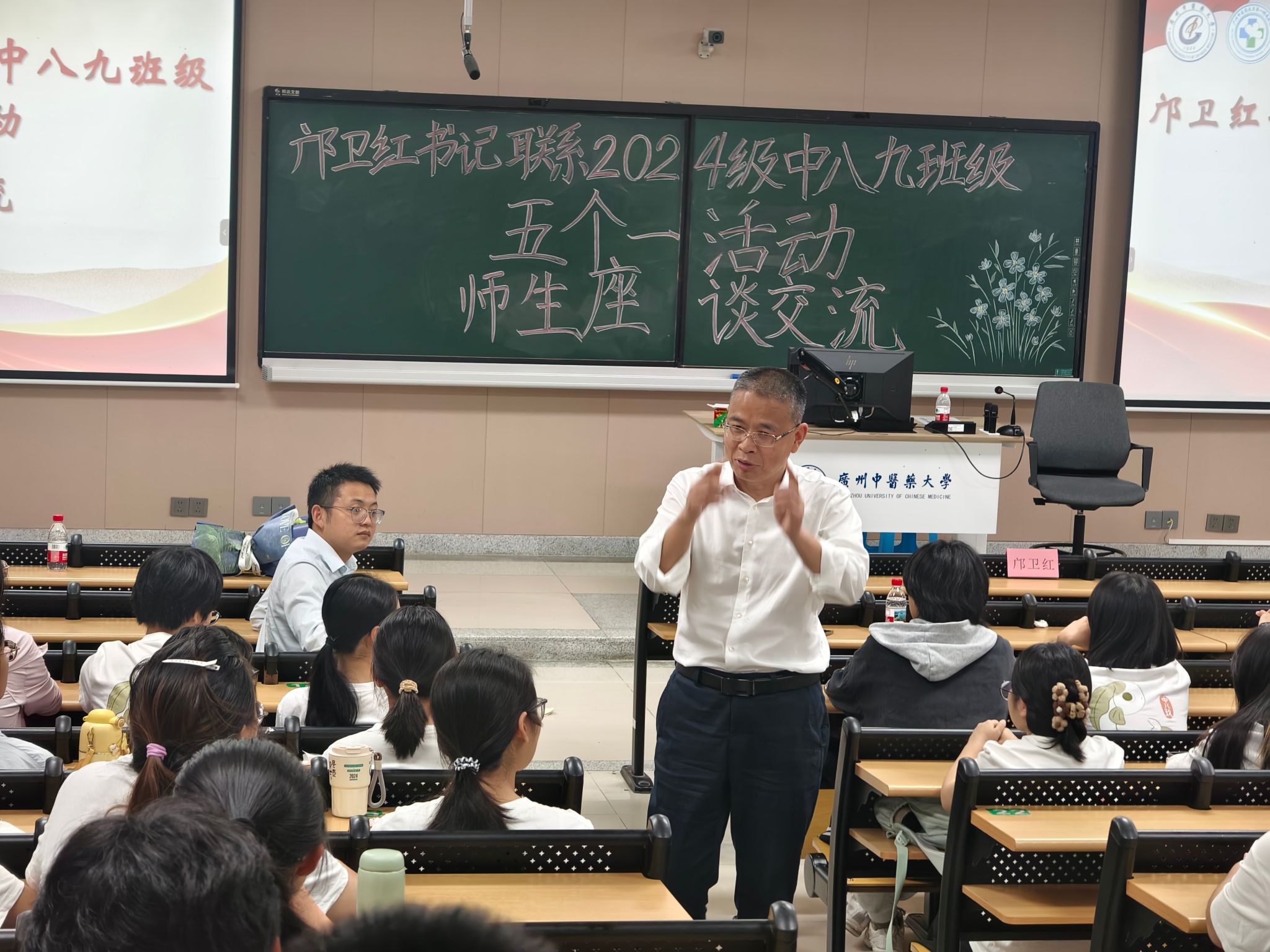 2026年4月1日晚,广州中医药大学大学城校区综合楼104室气氛热烈,第一临床医学院党委邝卫红书记联系2024级中八九班级“五个一”师生座谈交流会在此顺利举行。一院党委邝卫红书记、教育教学部龙泳伶部长、学工办陈小波副主任、学生团委黄婷书记、辅导员陈弘浩老师与中八九班级全体同学齐聚一堂,围绕同学们在学习、生活中遇到的实际困惑展开深入交流。